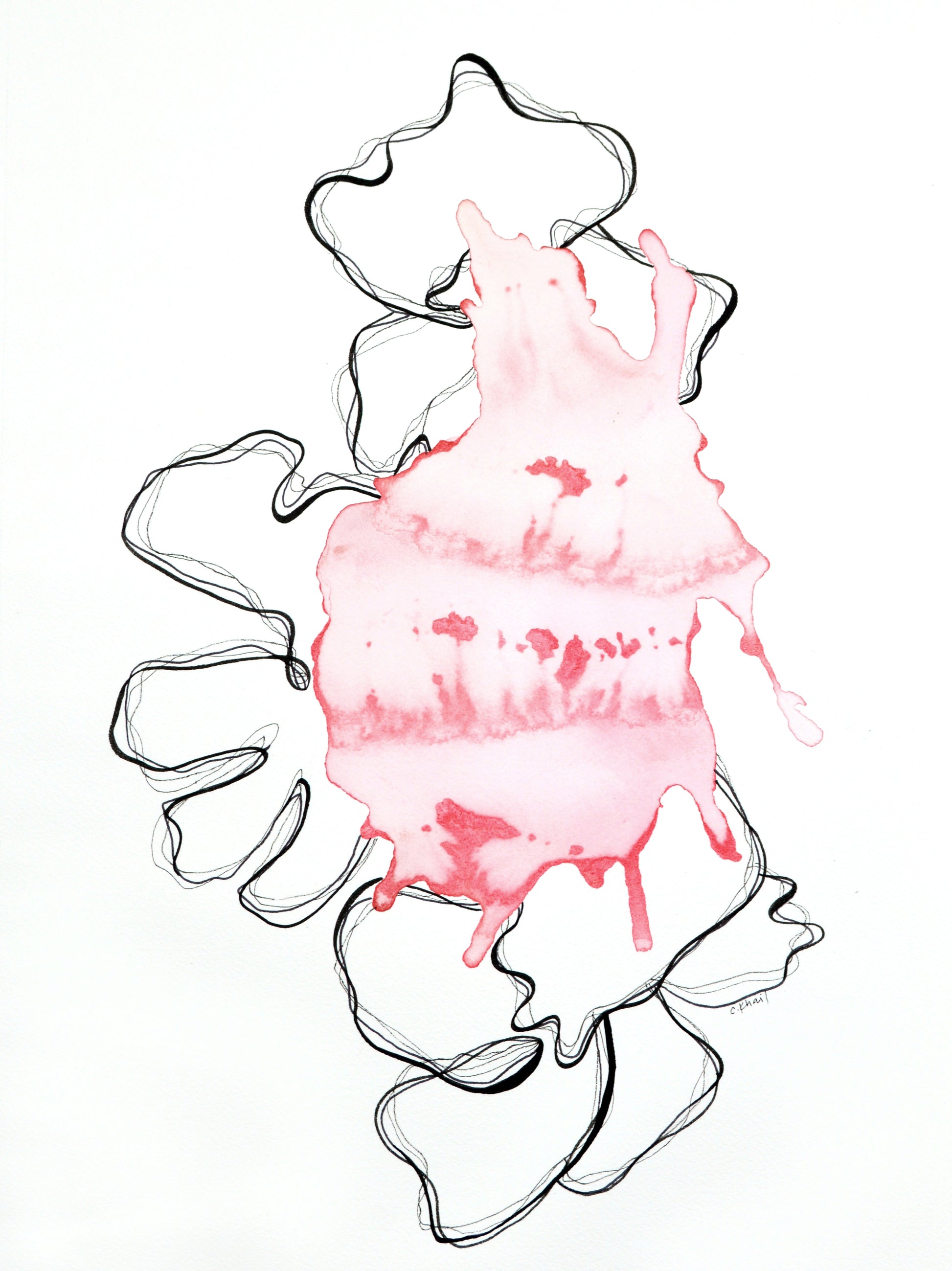 What the artist saysI introduce color through organic pools of pigment which overlap, interact, and spill past the boundaries of my lines, symbolize the push and pull of our imperfect alignment within the ever-changing boundaries and expectations of society.